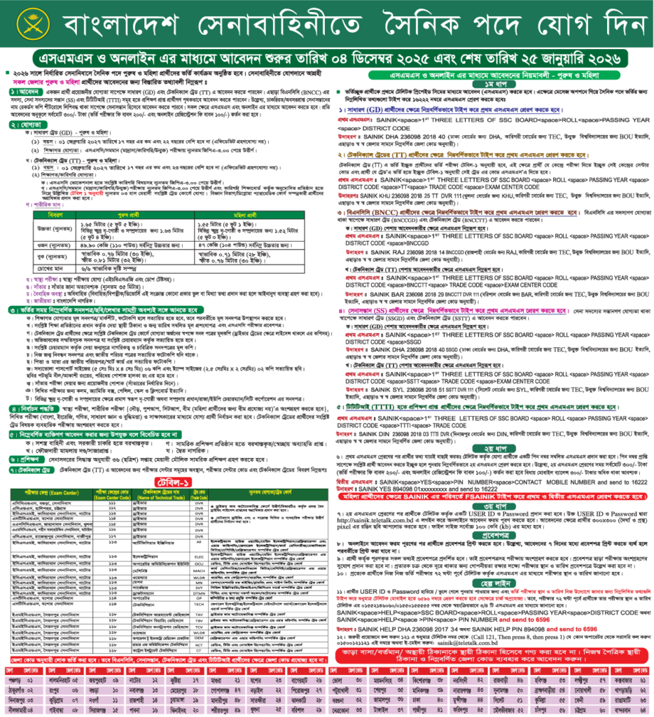 The online application for the Bangladesh Army Sainik post will start on 04 December 2025 and will end on 25 January 2026. Interested and eligible male and female candidates can apply online through the official website sainik.teletalk.com.bd.